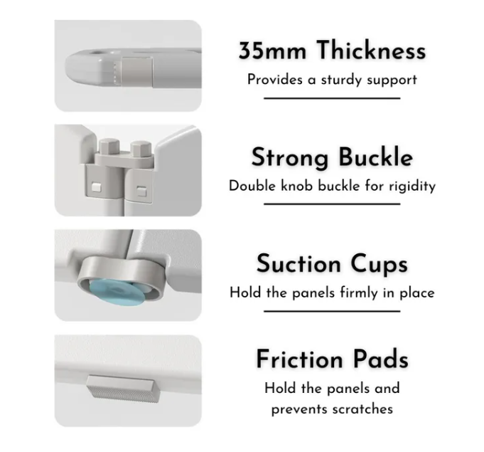 - בתחתיות הפנלים יש 2 חיבורים וואקום לריצפה ליציבות ולמניעת נפילה של הגדר כמו תמיד, אצלנו יש גם רפידה נוספת המיועדת למניעת שריטות בריצפה שלכם.